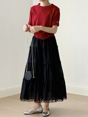 【韓国風ハイウエスト】チュールレース ロングスカート クロ/F
