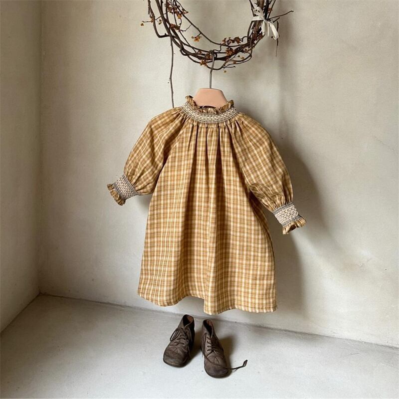 おしゃれなチェック柄が目を引く、女の子用の長袖ワンピースです。