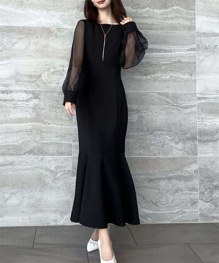 【上品シルエット】シースルースリーブ マーメイドワンピース