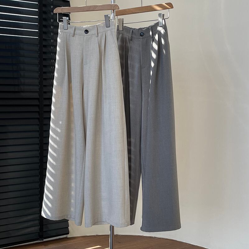 普段使いから通勤までOKな、ゆったりとしたシルエットのスラックス。ウエストゴムで楽な穿き心地なのに、カジュアルにもきれいめにも着こなせる便利な一枚。グレーとオフホワイトの2色展開です。