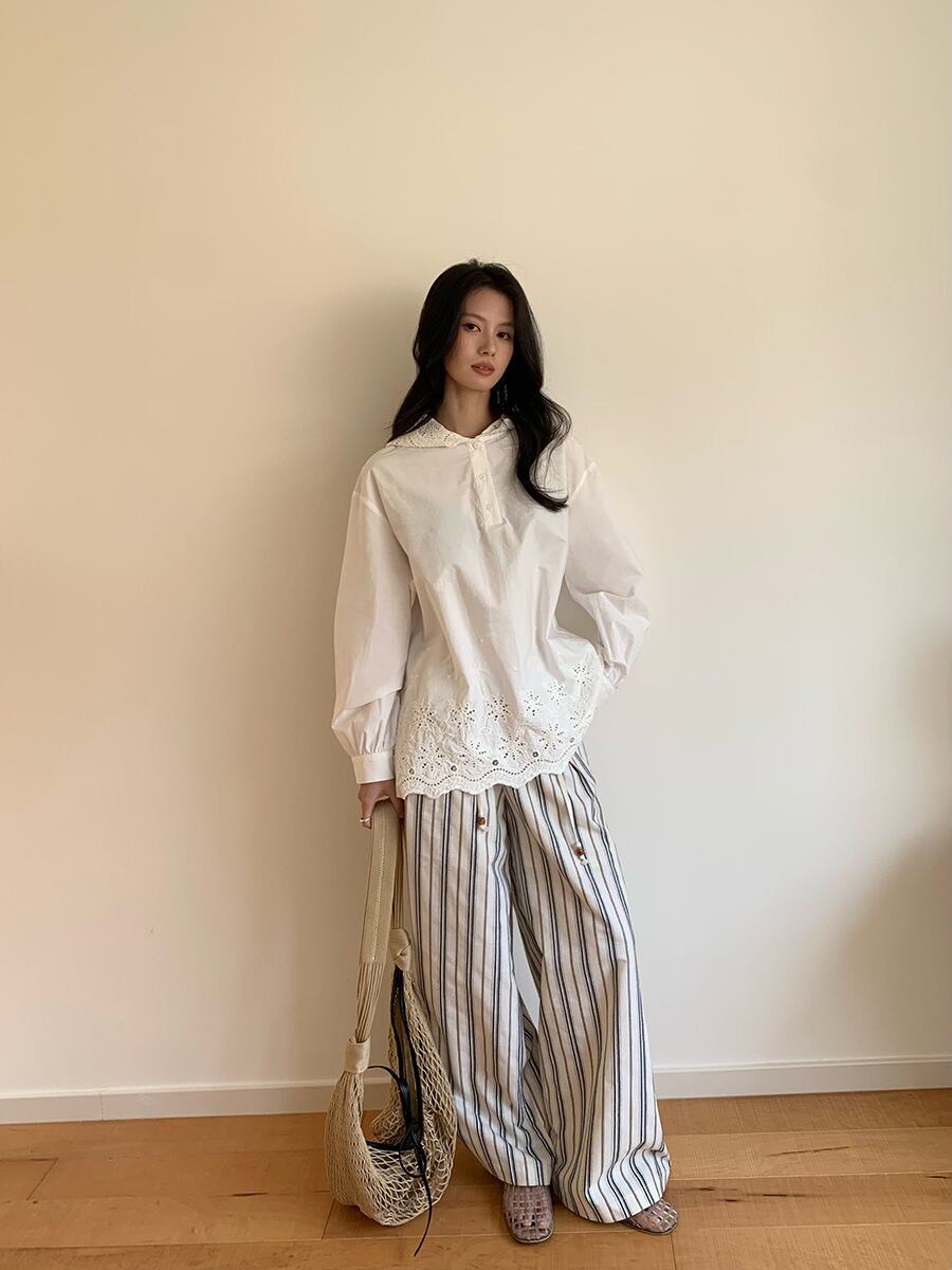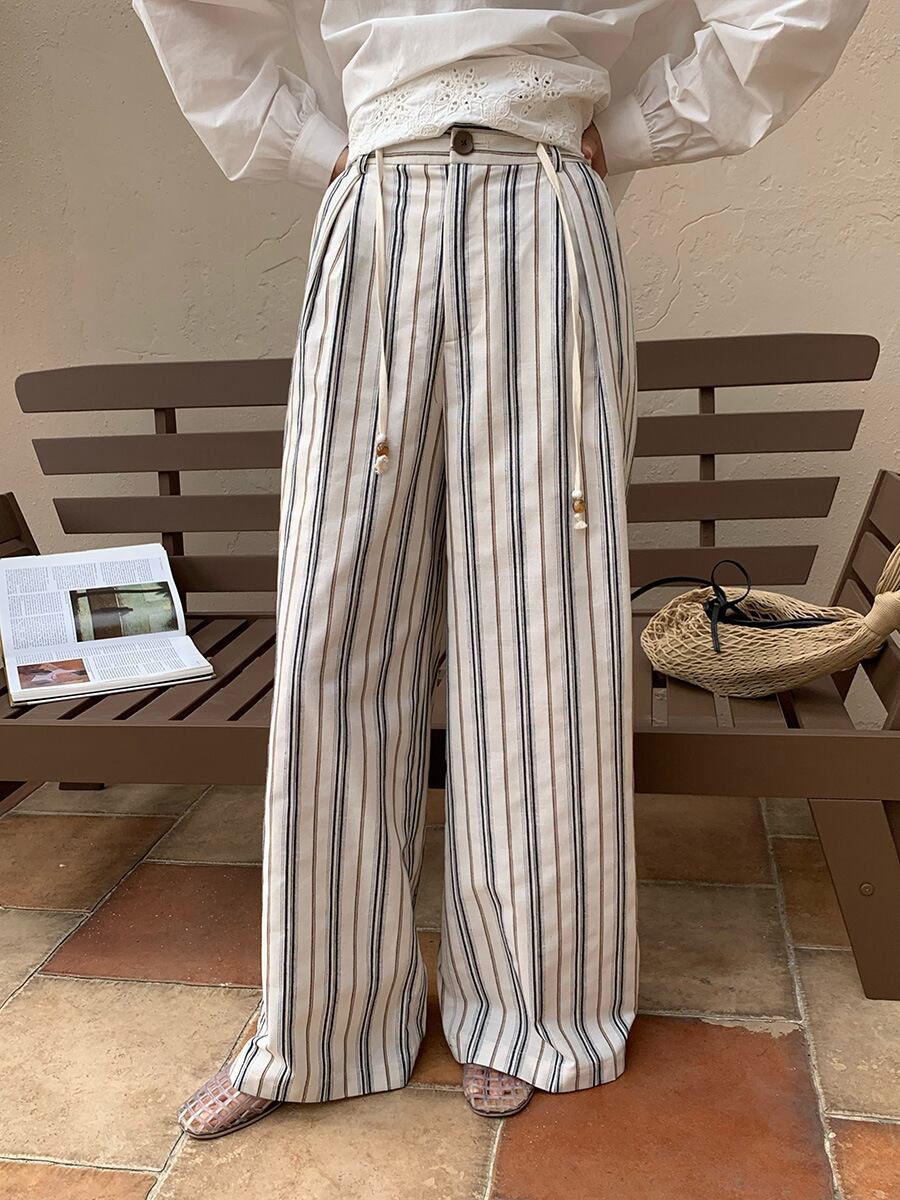 縦のラインがすっきりとした印象を与えるストライプ柄のワイドパンツ。カジュアルながらも、オフィススタイルにも取り入れやすいデザインです。