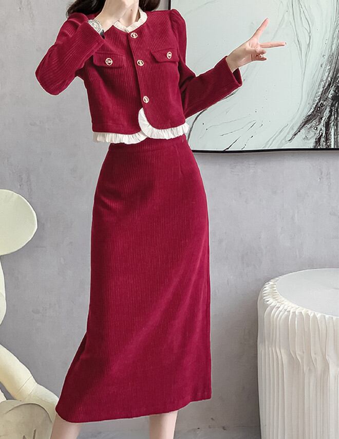 【体型カバー・着心地良】コーデュロイ ジャケット&ロングスカート セットアップ