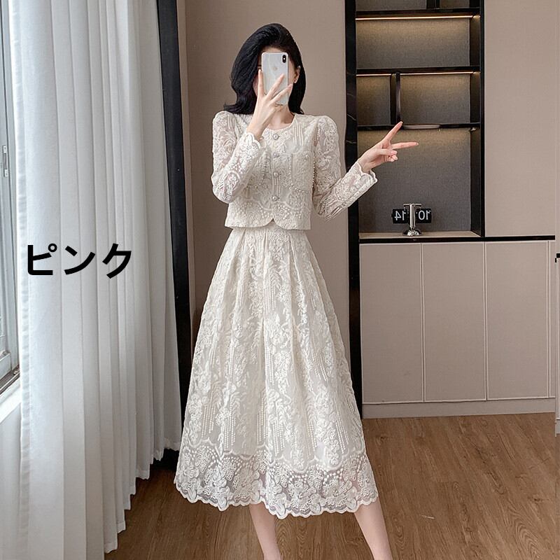 ノーカラーのラウンドネックが可愛らしい印象を与え、着るだけでXラインが作れるジャケットでスタイルアップを約束するセットアップです。華やかな花柄刺繍のロングフレアスカートとの組み合わせは、パーティーから普段のお出かけまで、どんなシーンにも合わせられる着回し力が魅力です。