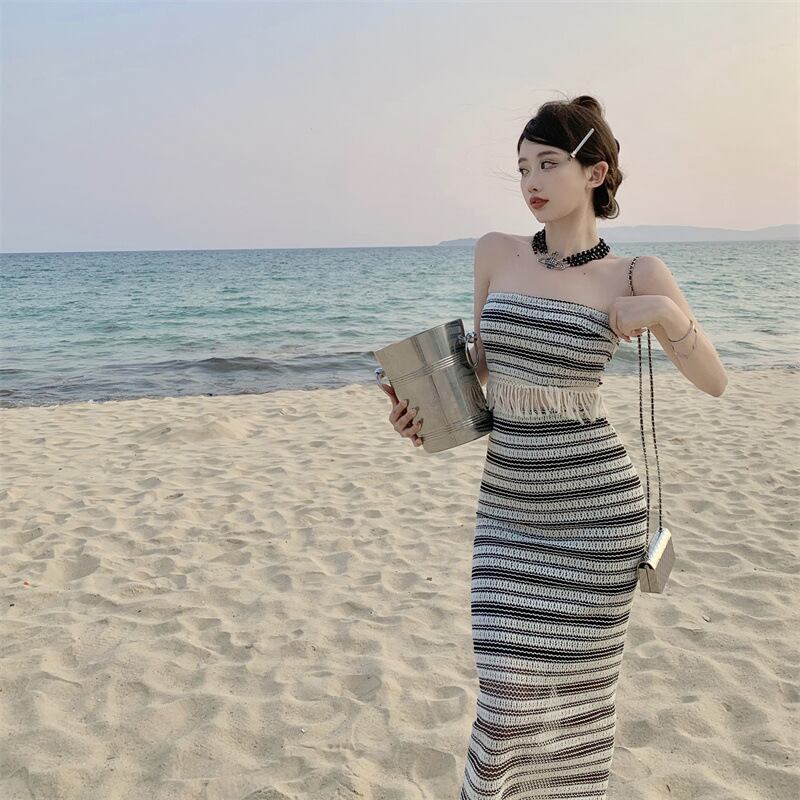 ベアトップデザインのトップスがデコルテや背中をセクシーに肌見せし、スカートは体にフィットするタイトシルエットで女性らしいボディラインを強調するセットアップです。おしゃれなワンマイルウェアとしてもおすすめです。