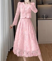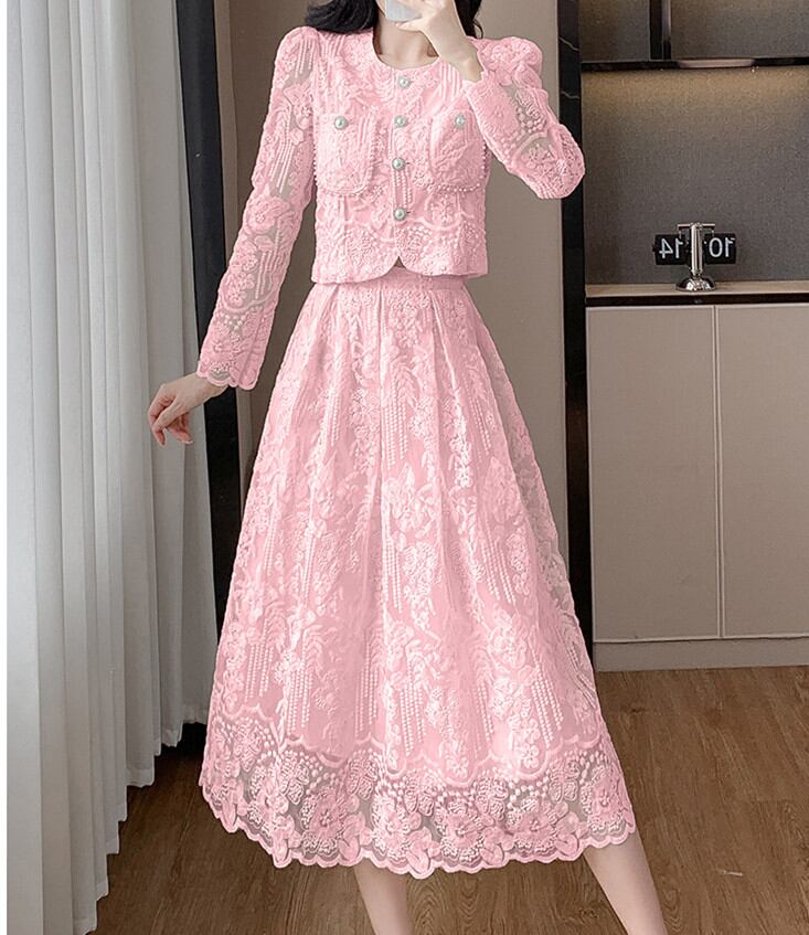 華やかな花柄刺繍のロングスカートと、女性らしいレースドレスデザインが魅力。パーティーシーンから普段のお出かけまで、どんなシーンにも合わせられる着回し力抜群の上下セットです。体型カバーも叶えつつ、上品さを演出します。