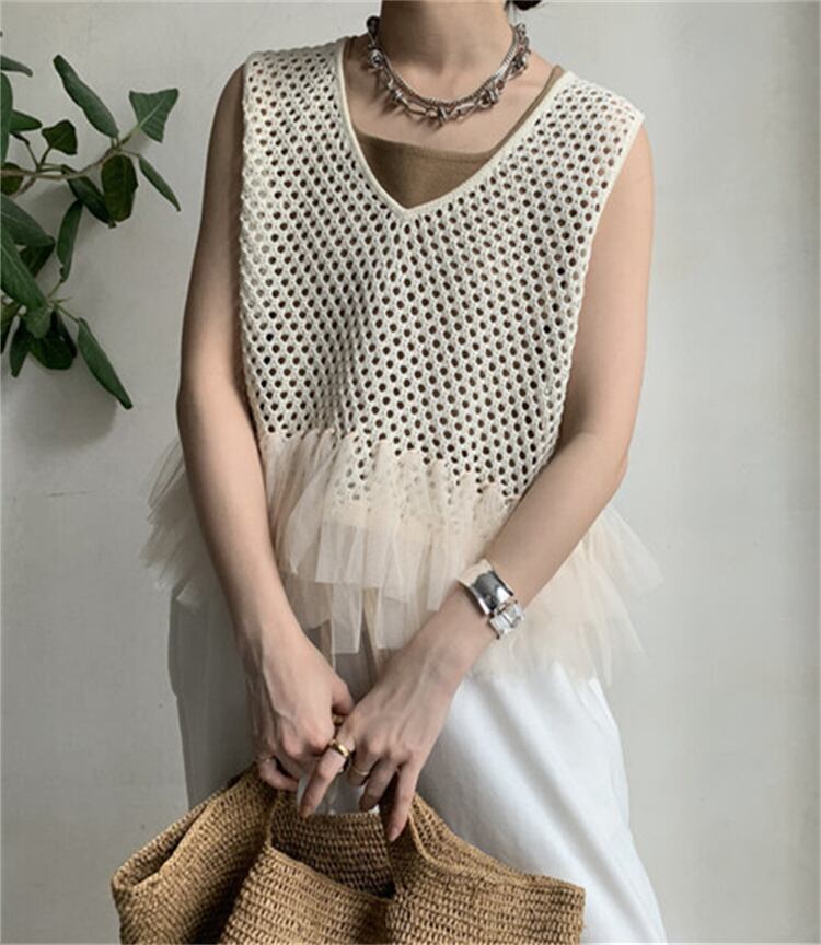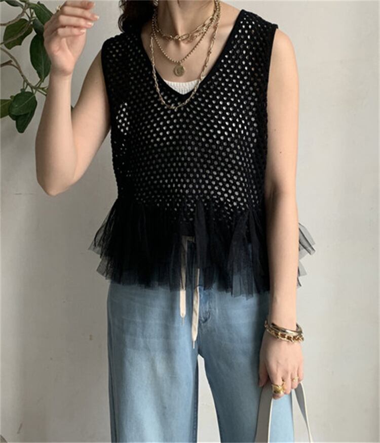 繊細なネットレースとパッチワークデザインが特徴で、洗練された雰囲気を演出します。ベストとしてもキャミソールとしても活躍し、様々なレイヤードスタイルが楽しめる一枚。韓国ファッションならではのデザインセンスが光る、この夏注目のアイテムです。
