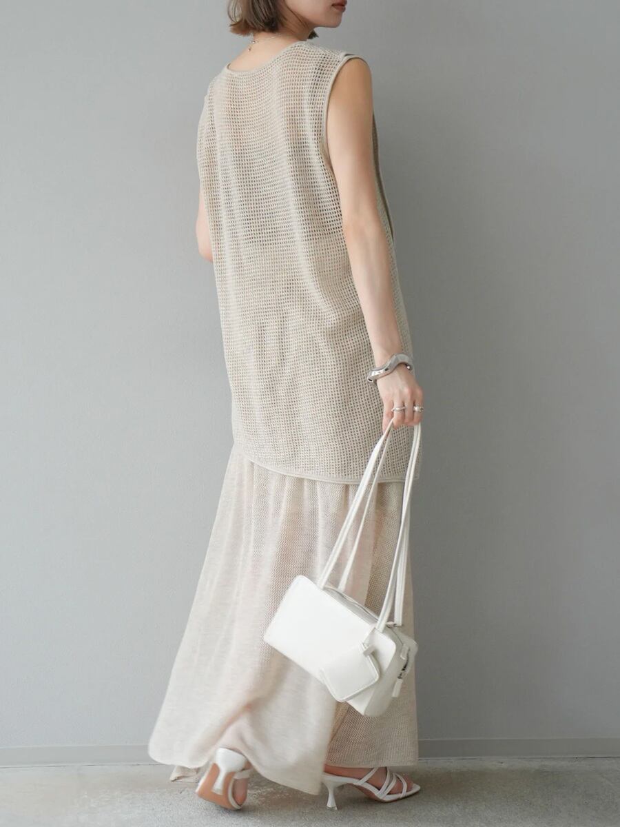 トレンド感あふれる「中空」デザインがおしゃれなニットセットアップです。トップスとスカートがセットになっており、それぞれ単品使いも可能でマルチに活躍します。
