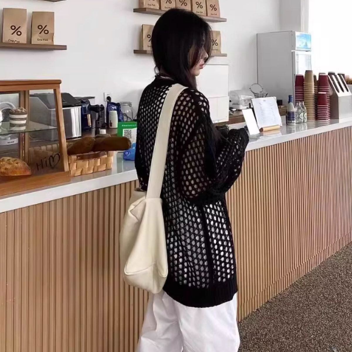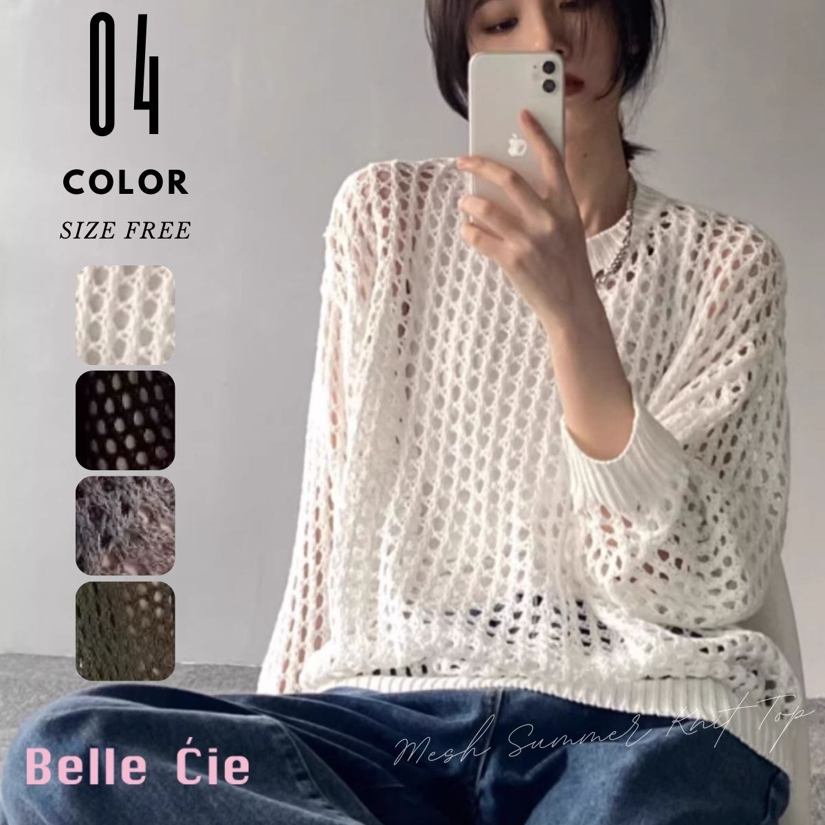 大胆に透け感のあるメッシュ風のかぎ針編みニットトップスです。程よいルーズ感でゆるすぎずタイトすぎない絶妙なサイズ感がおしゃれでかっこいいデザイン。